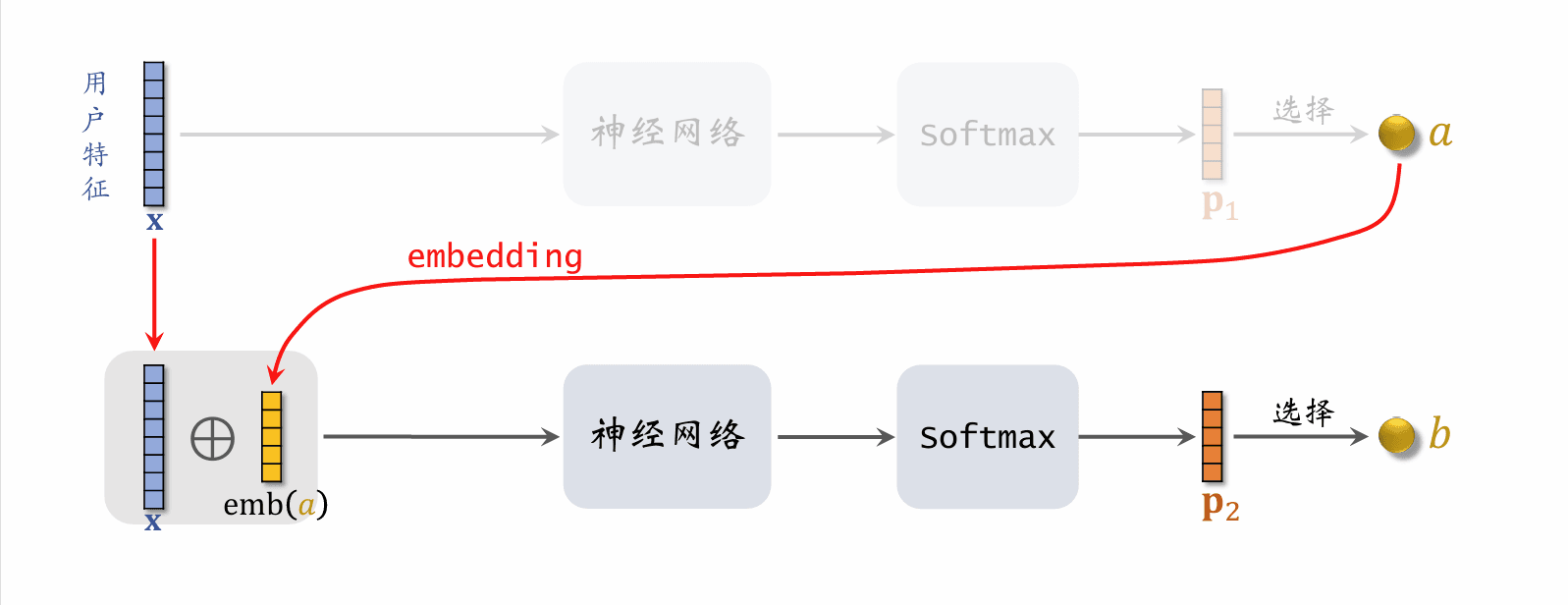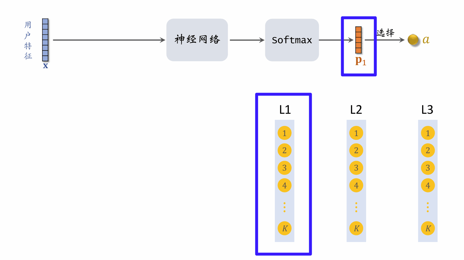 • 给定用户特征 x\mathbf{x},用神经网络预估用户对路径 path=[a,b,c]\text{path} = [a, b, c] 的兴趣,分数记作 p(pathx)p(\text{path} \mid \mathbf{x})
