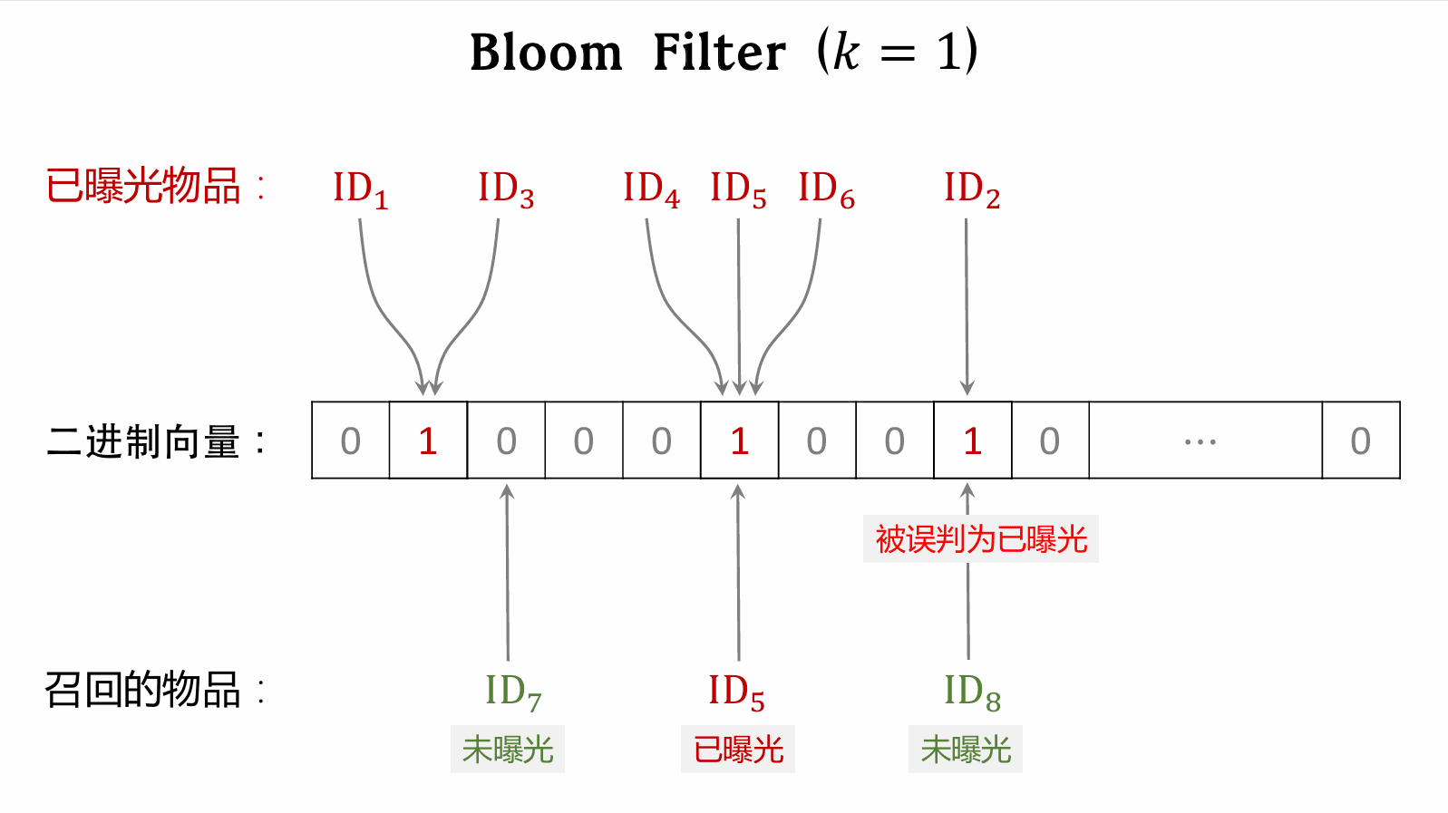 • 如果判断为 yes,那么该物品很可能在集合中。 (可能误伤,错误判断未曝光物品为已曝光,将其过滤掉。)